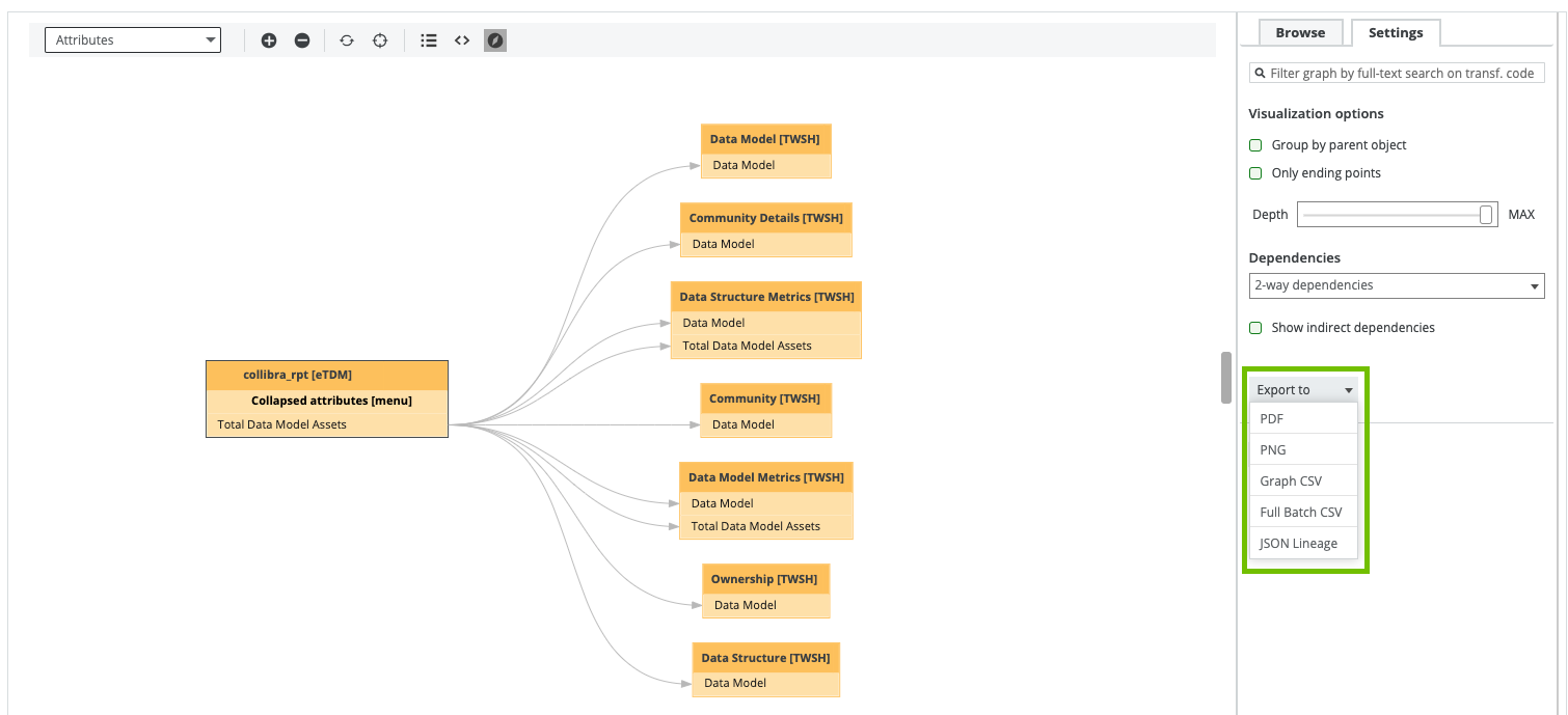 You can export the information in one of the following formats by clicking the Export button () in the toolbar of the technical lineage graph: