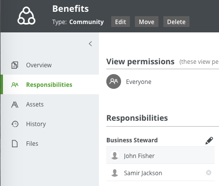 Note The gray background behind "John Fisher" indicates that the responsibility was inherited from the Human Resources community. The white background behind "Samir Jackson" indicates that the responsibility was directly created for the Benefits community.