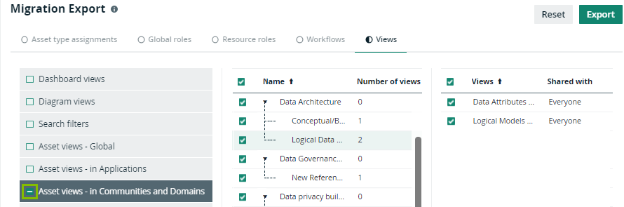 - If you want to export all available views in all community and domain pages, select the checkbox in front of Asset views - in Communities and Domains in the filter pane.