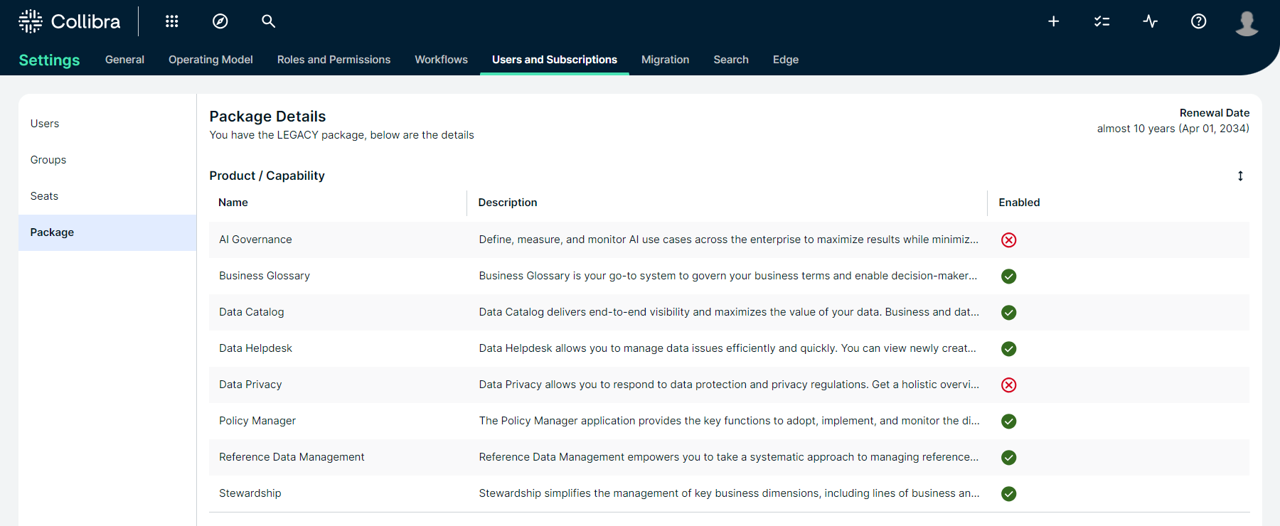 The Package page offers an overview of the products and capabilities that are enabled in your environment.