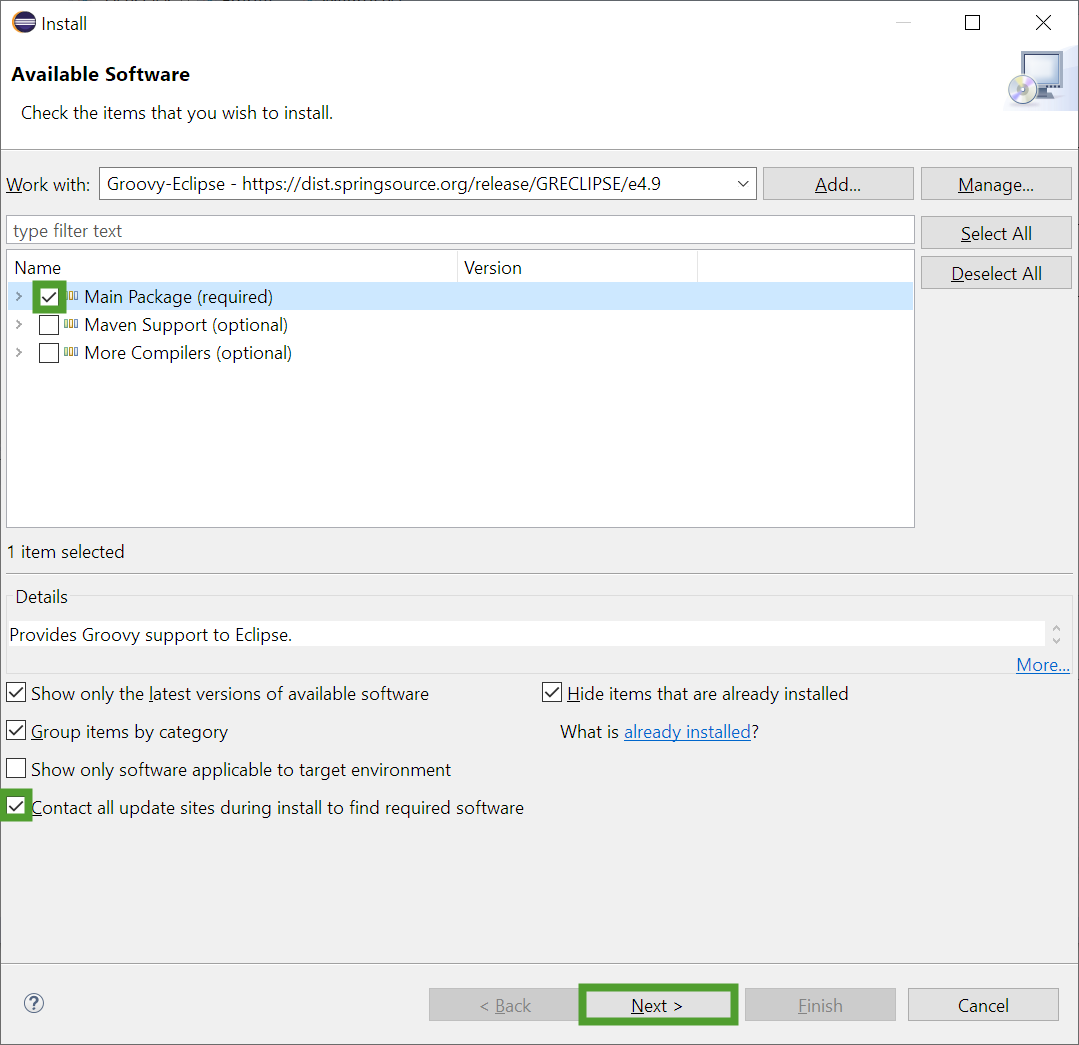 4. In the Available Software window, select the Main Package check box.