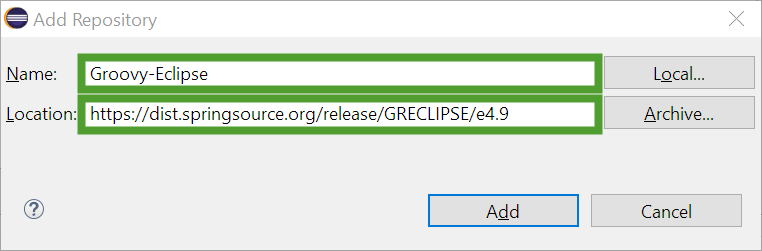 2. Enter the appropriate link for your Eclipse version as specified on the Groovy-Eclipse page in the Location field. We are using https://dist.springsource.org/release/GRECLIPSE/e4.9 in this example.