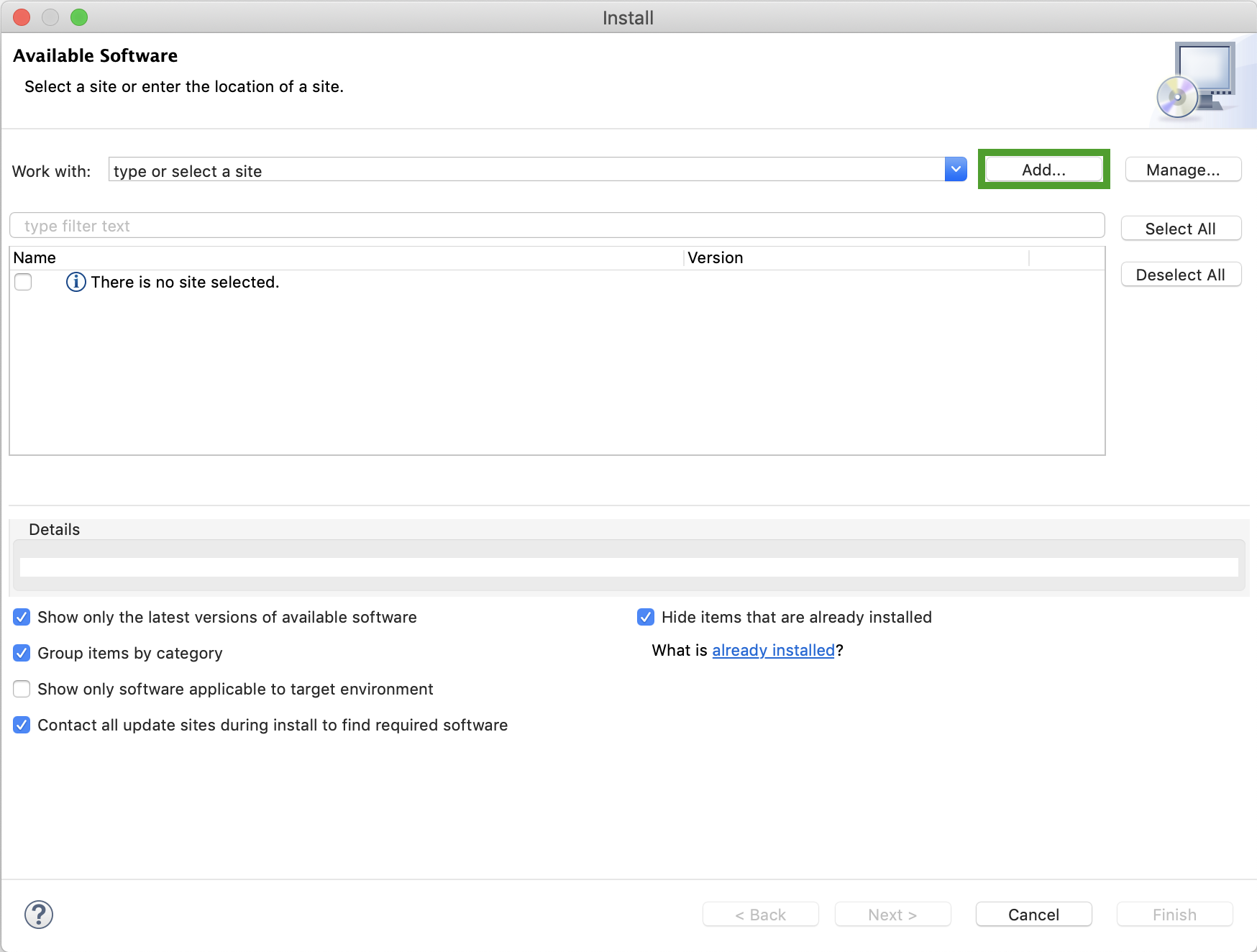 5. Ensure the Contact all update sites during install to find required software check box is selected and click Next.