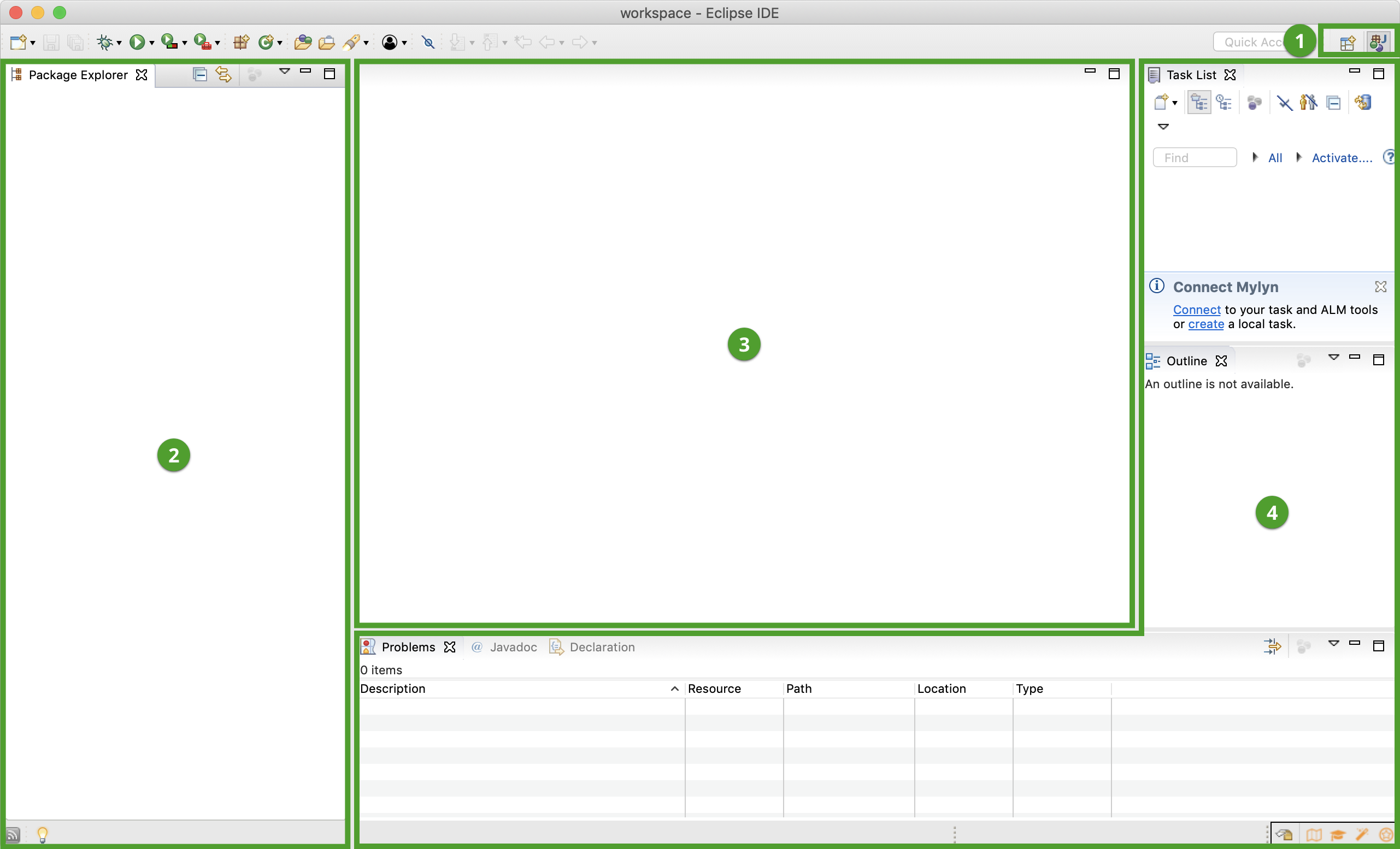Note  If the Open Perspective icon is not visible, right click on an empty area of the toolbar and select Restore Hidden Toolbar Entries or access the perspectives via the menu: WindowPerspectiveOpen PerspectiveOther.