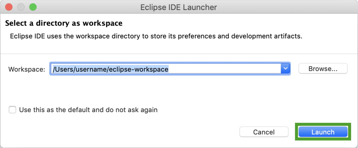 8. When prompted or set a custom folder, click Launch to accept the default workspace, a folder where your projects are stored.