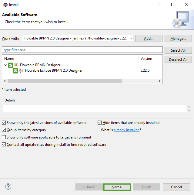 4. In the Available Software window, select the Flowable BPMN Designer check box.