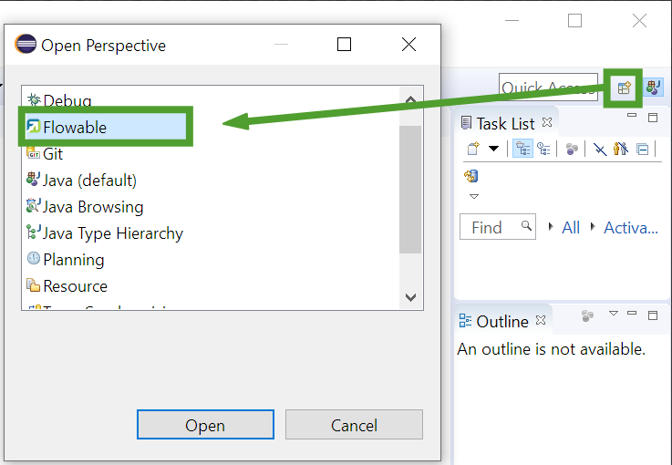 When Eclipse is restarted after the installation, switch to the Flowable perspective to optimize the workbench for designing diagrams: