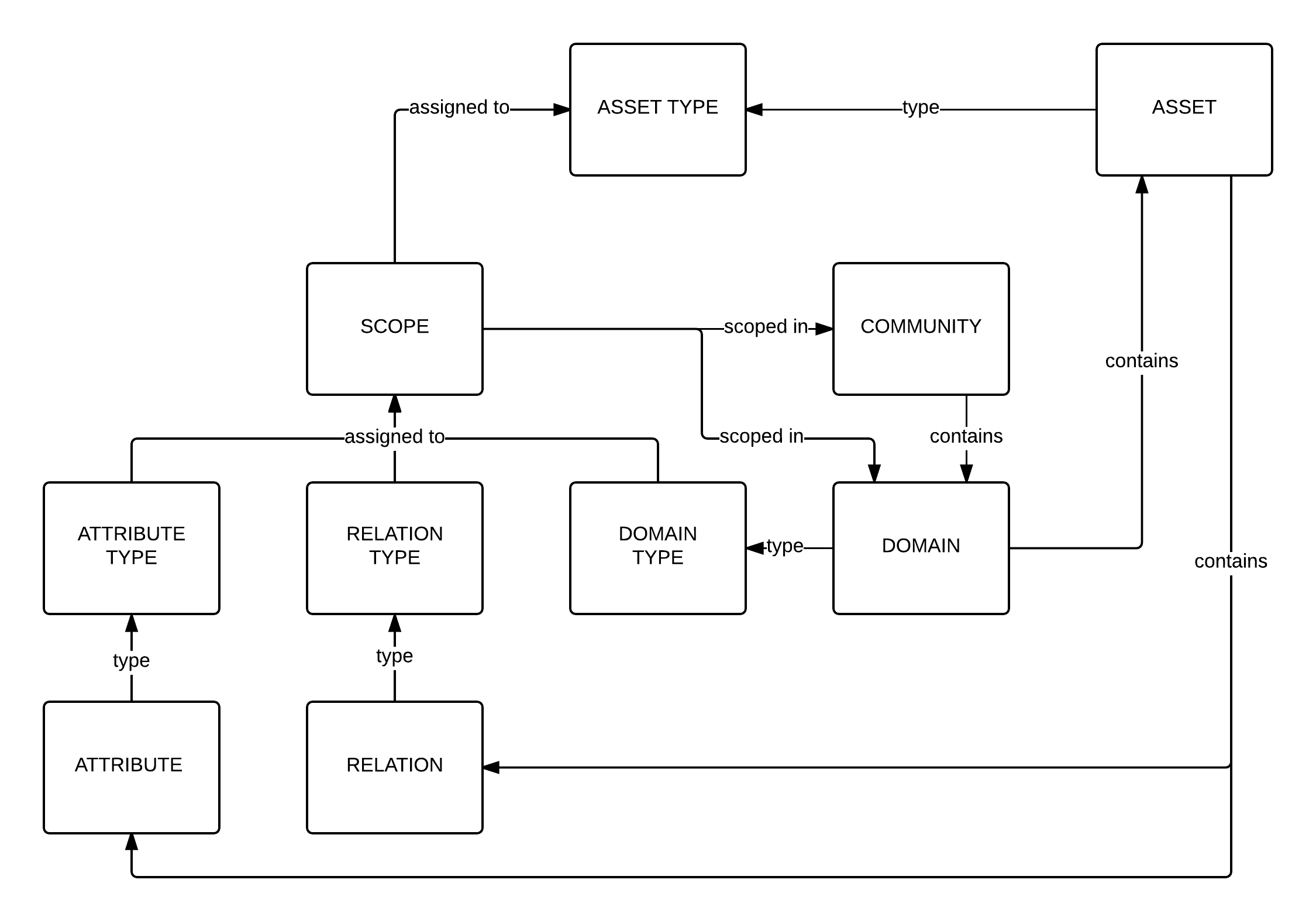 A scope is a selection of communities and domains that you can assign to one or more asset types. In a scope, you can define domain types, attribute types, relation types, and other configurations. It is an efficient way to configure asset types for specific group needs without cluttering Collibra with custom asset types. |