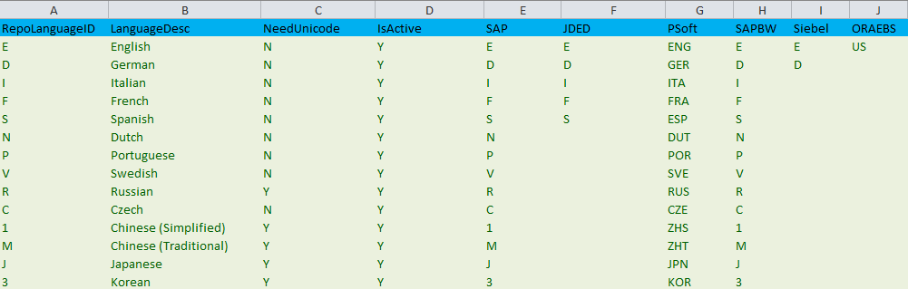 This worksheet lists the available languages for extraction of descriptive fields from each Enterprise Application. A typical set of language codes for each Enterprise Application are coded in this worksheet, but you may need to add your own if you wish to extract metadata in a language not included in the list. The worksheet format is shown in the following example: