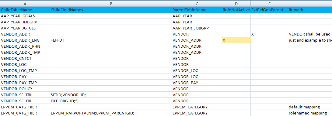 This worksheet is used by the Rules Based Relationship Generation feature of ERP/CRM Integrator to create additional relationships for a PeopleSoft Repository. Please see the ERP/CRM Integrator User Guide for more details on how to use this feature. The worksheet format is shown in the following example: