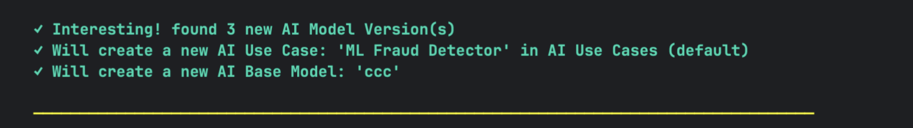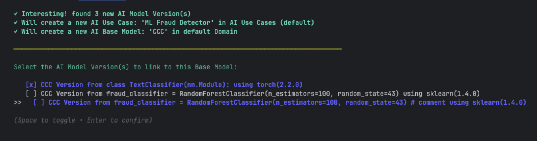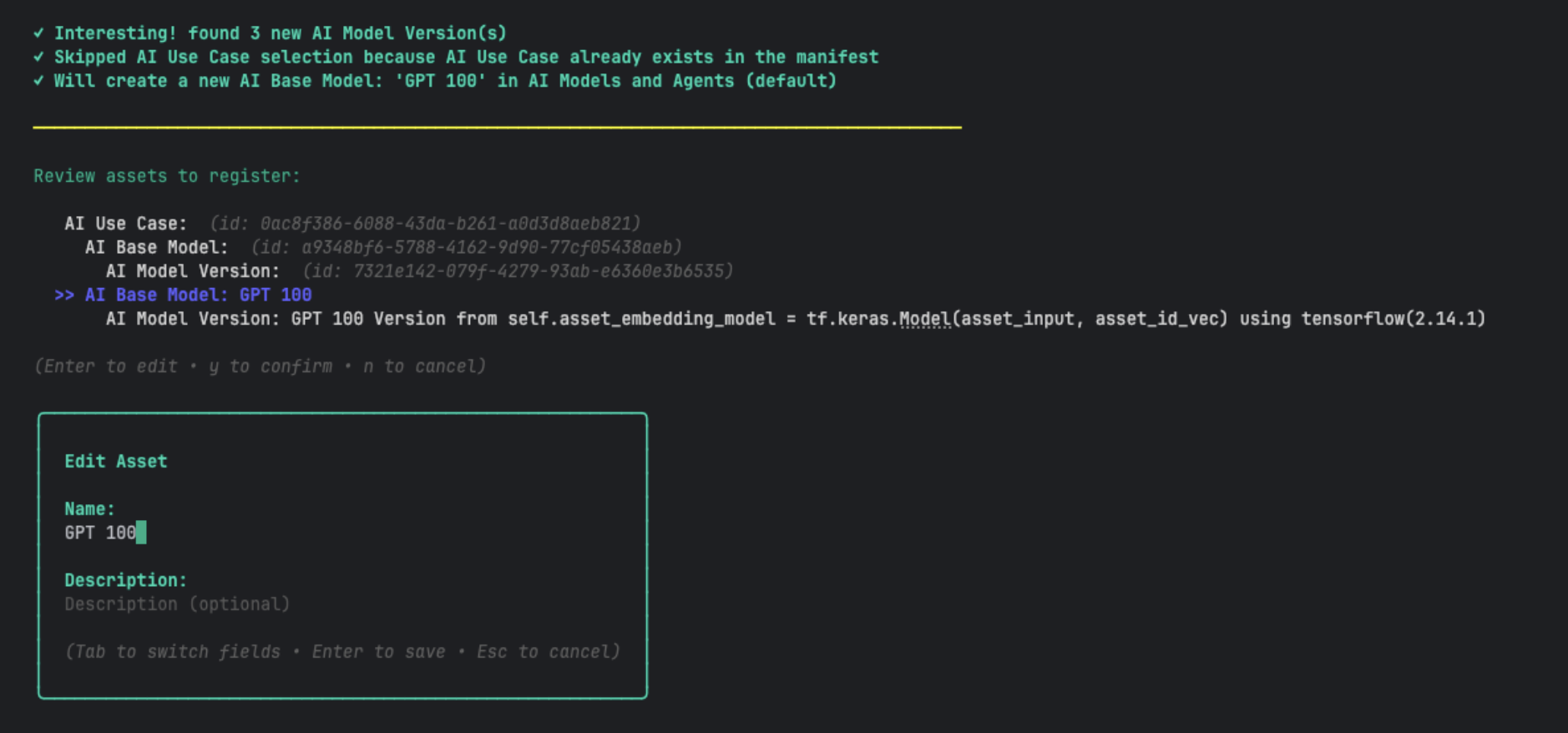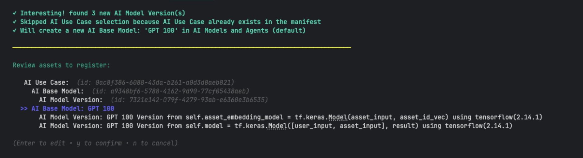 - You initiate the entire governance workflow with a single command. This process scans your source code for AI model patterns and loads existing YAML manifest files to filter out any models that have already been registered or rejected. The CLI then guides you through the model version registration process, where you can also register new AI Use Cases and Base Models or link your versions to existing assets.