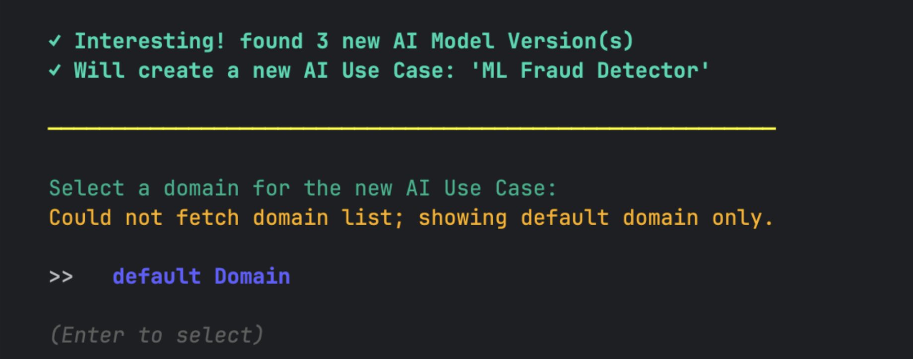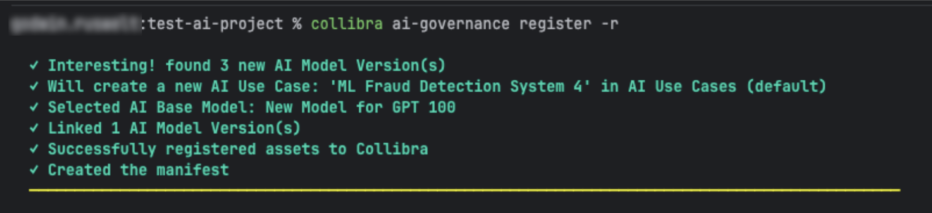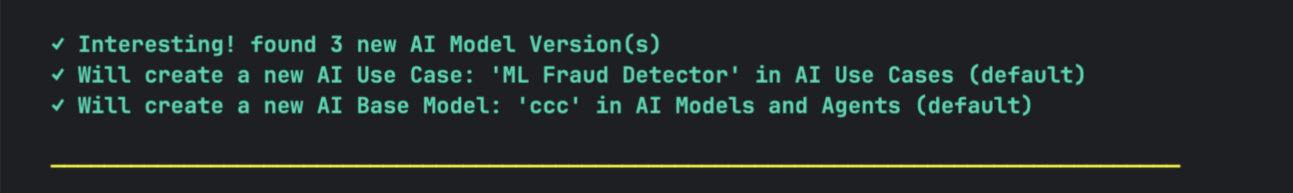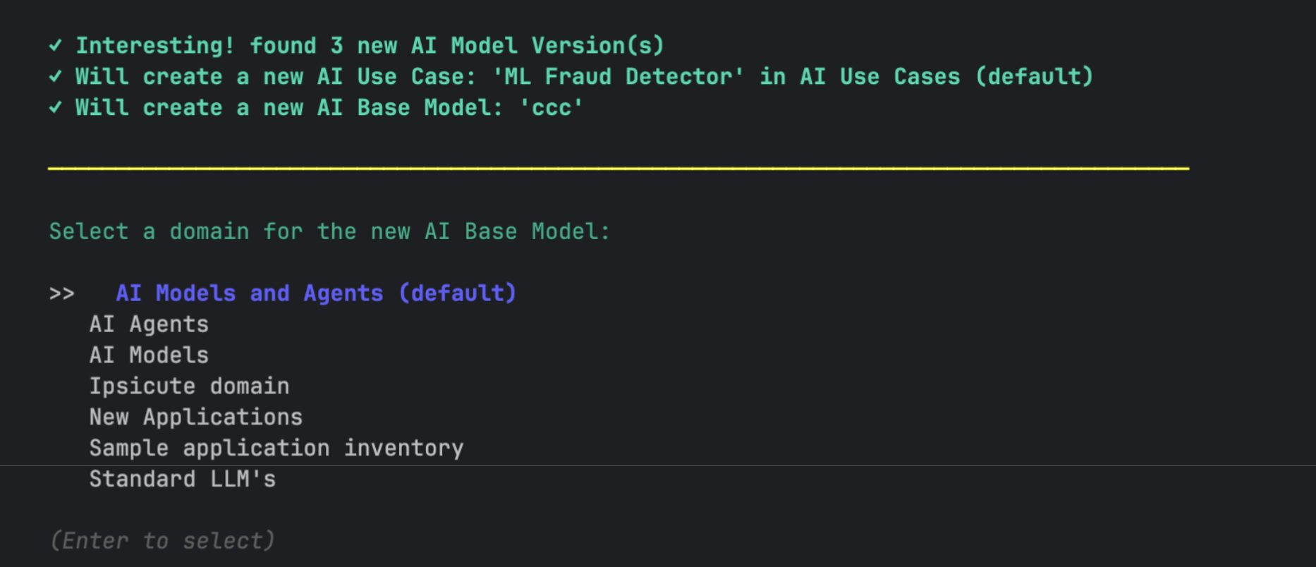 - You initiate the entire governance workflow with a single command. This process scans your source code for AI model patterns and loads existing YAML manifest files to filter out any models that have already been registered or rejected. The CLI then guides you through the model version registration process, where you can also register new AI Use Cases and Base Models or link your versions to existing assets.