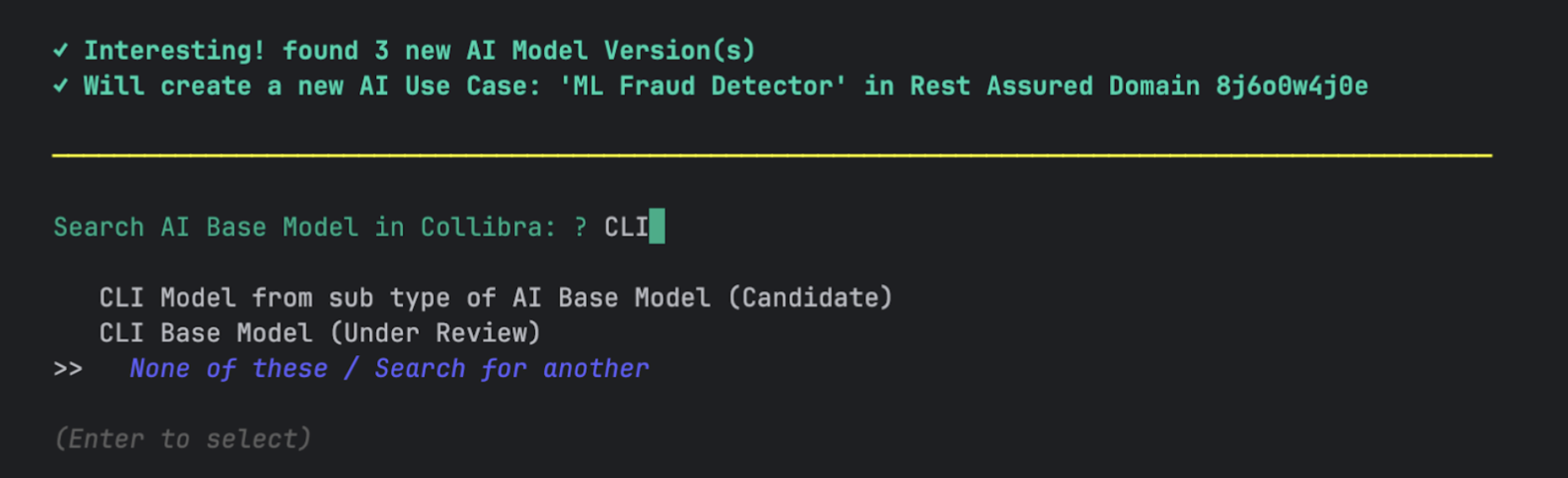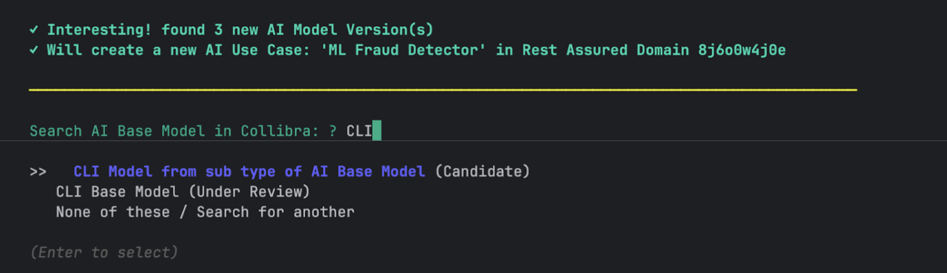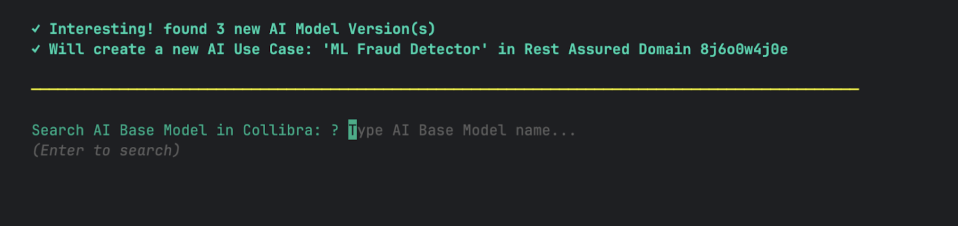 The CLI guides you through registering AI model versions and linking them to a new or existing (in Collibra) AI base model and AI use case.