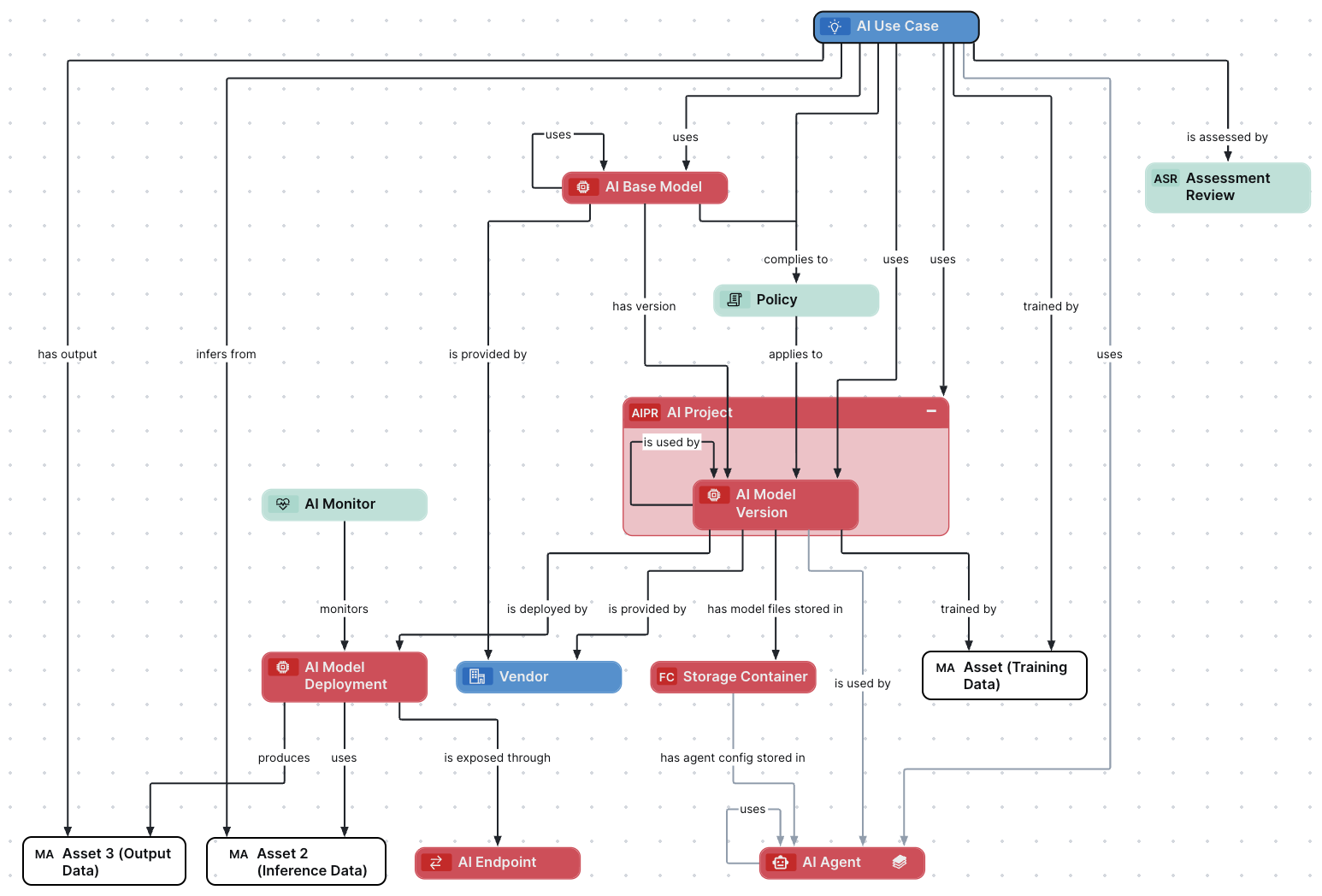 | complies to Governance Asset | Asset (AI Base Model) complies to / applies to Governance Asset (Policy) | AssetCompliesToGovernanceAsset |