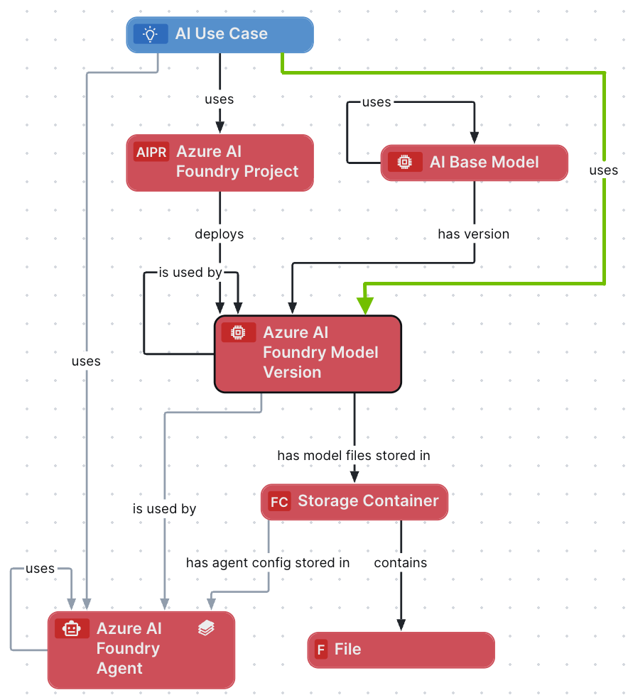 For all Azure AI Foundry Model Version assets that are related to the Azure AI Foundry Project, relations are automatically created between those Azure AI Foundry Model Version assets and your AI Use Case.
