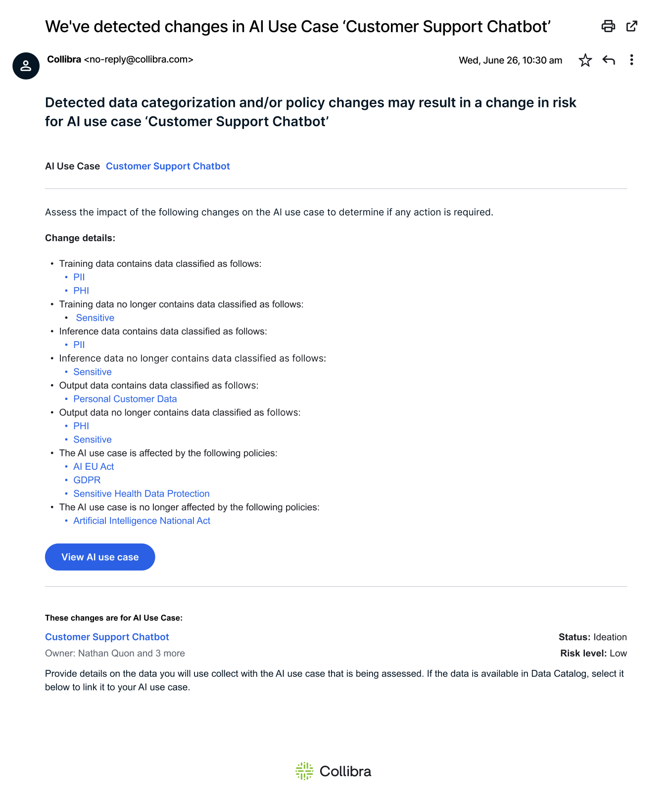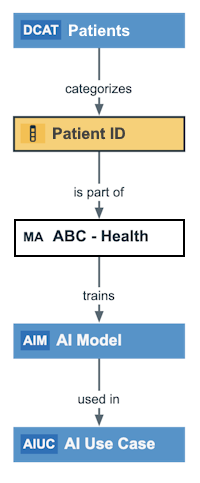 Data set ABC - Health contains a column named "Patient ID", which is categorized by a data category named "Patients", which is used to categorize patient-related assets that contain sensitive information. As such, all users and user groups who have been assigned any of the applicable responsibilities are notified via email of the indirect link between the data category and your AI use case.