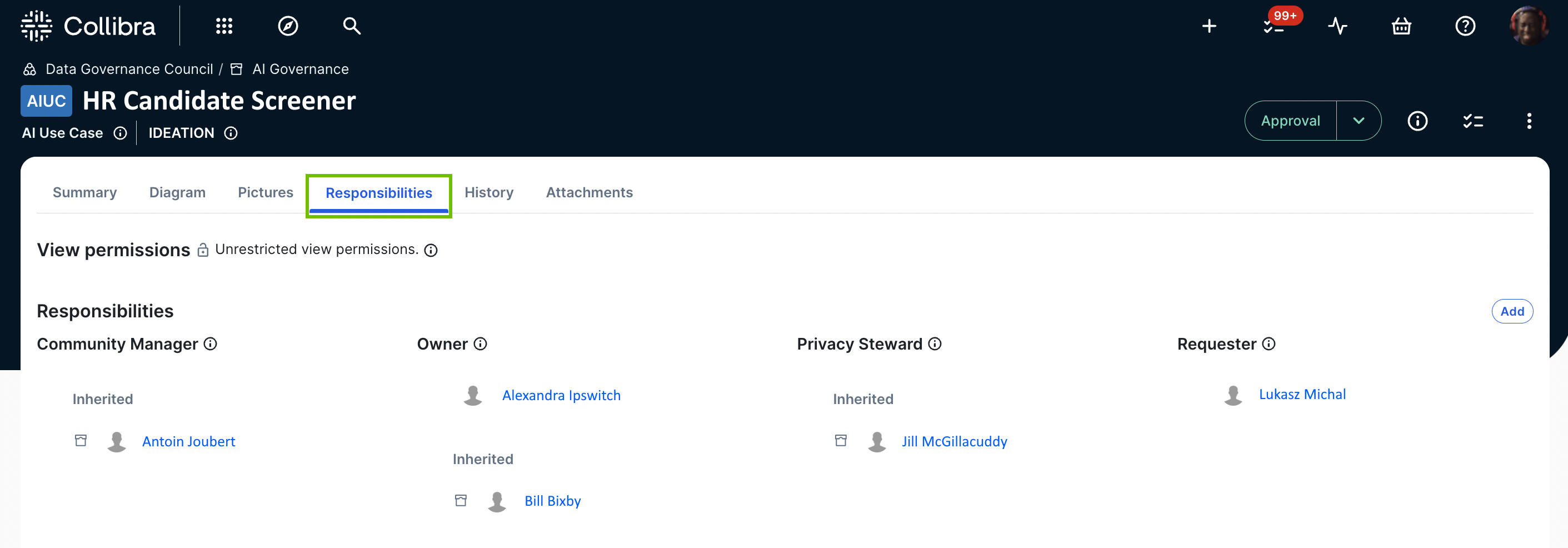 Note We recommend that you not apply view permissions on the communities and domains that contain Policy and Data Category assets. Policy and Data Category assets on AI Use Case and AI Model Version asset pages are not visible to users who are restricted by view permissions, even if they receive a notification prompting them to review an asset page.