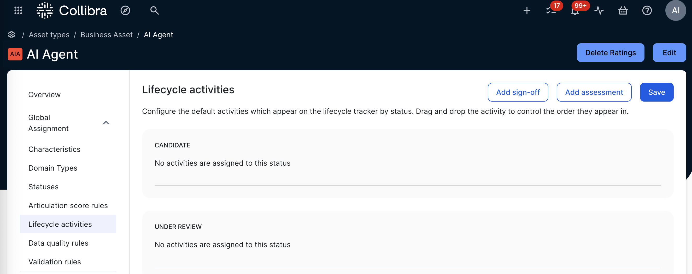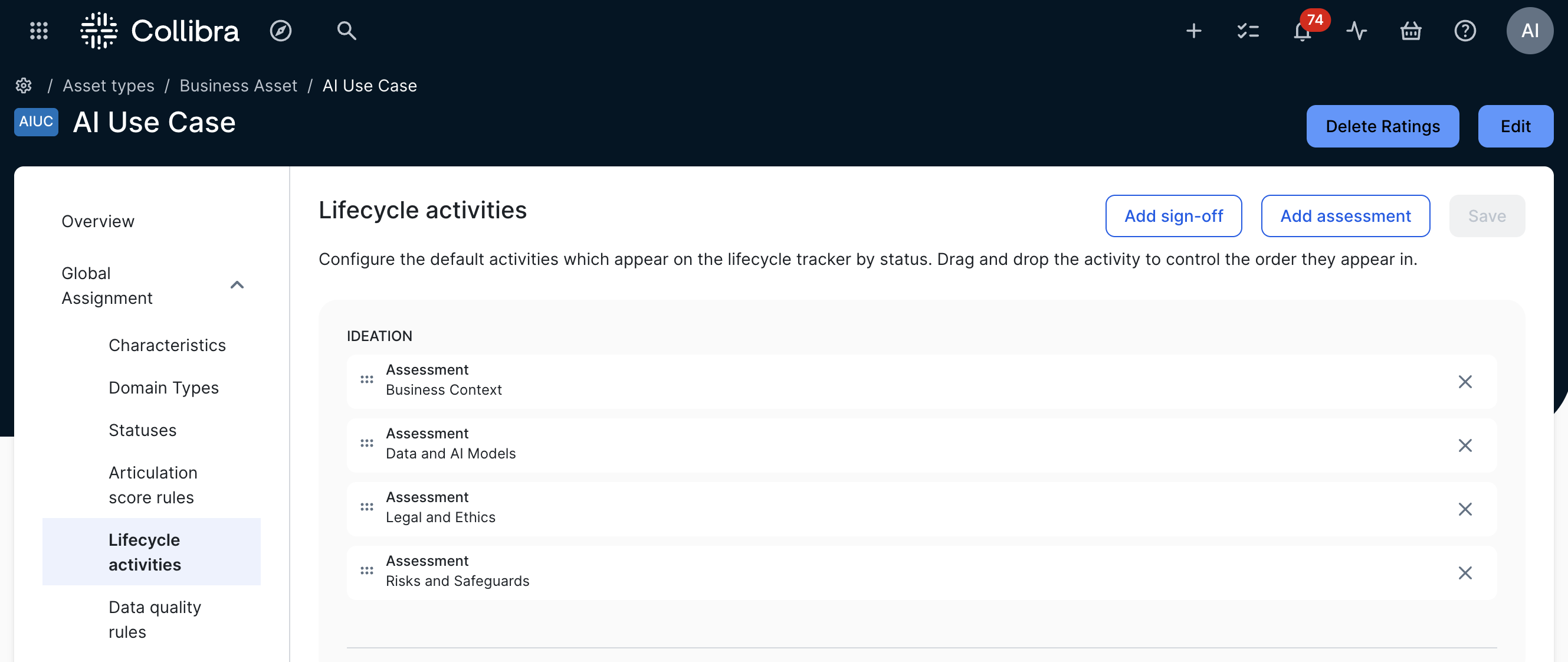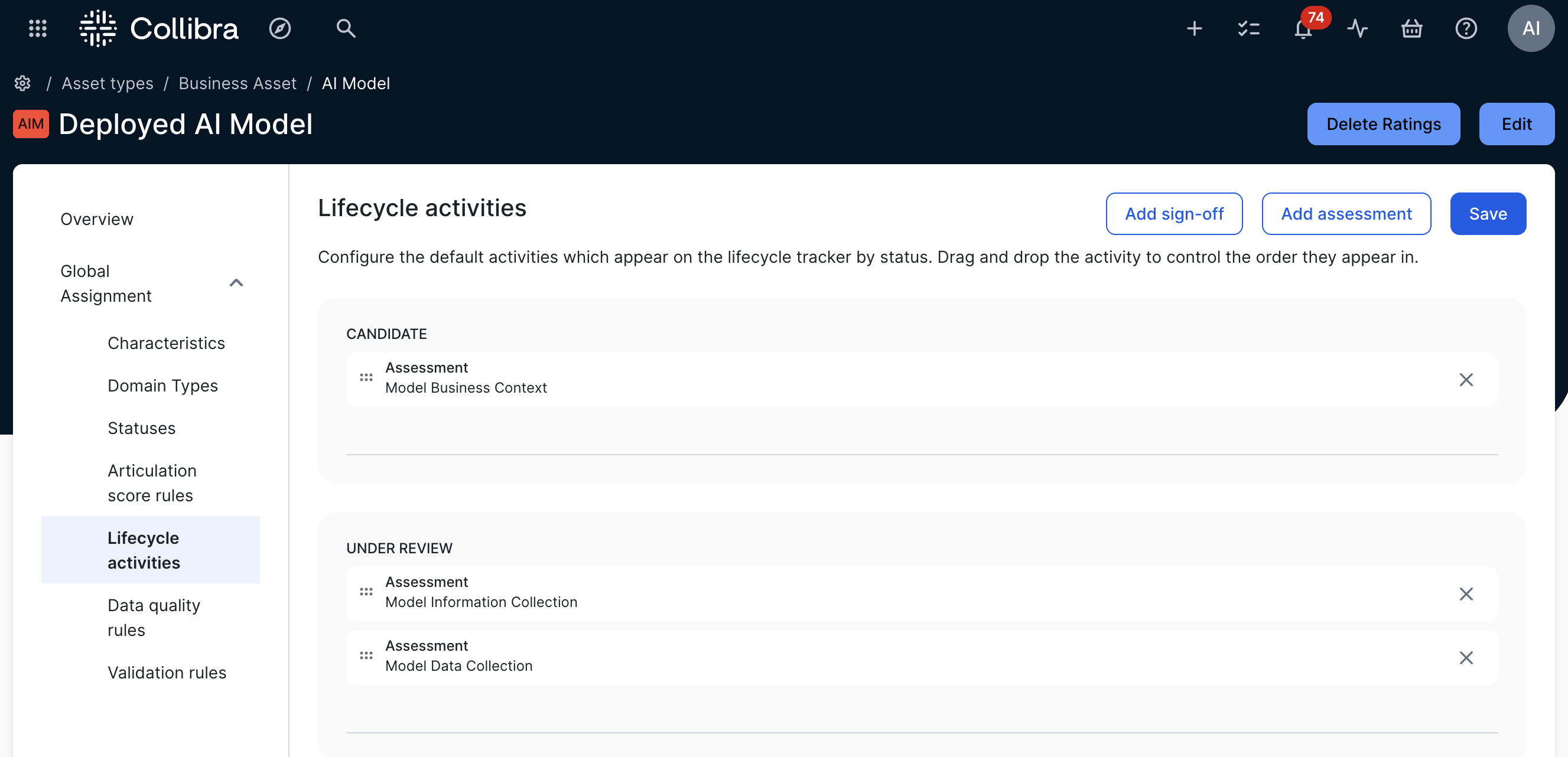 The asset type overview page opens. - In the tab pane, expand the Global Assignment tab or the tab of the relevant assignment, and then click Lifecycle.Note If only the Global Assignment tab is shown, it means no one in your organization has added another assignment. In this case, use the Global Assignment. For more information on assignments and scopes, go to Create scoped assignments for the AI Governance asset types.The Lifecycle page opens.Tip The lifecycle stages that head the sections shown on this page (for example, Ideation, Development, and Monitoring) reflect the statuses that are configured for the asset type. The order cannot be changed on this page. To configure the lifecycle stages through which you want your assets to evolve, go to Configure the lifecycle stages of AI Governance assets.