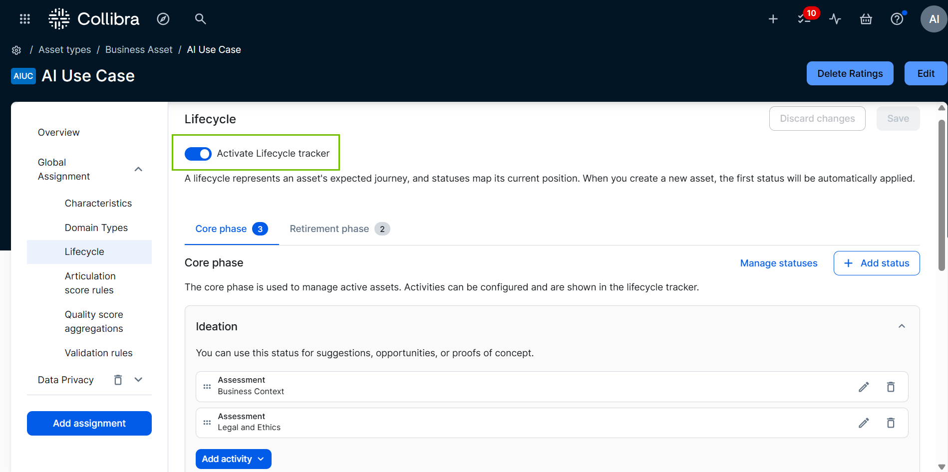 The Activate Lifecycle tracker option is selected in the asset type's global assignment or relevant assignment.