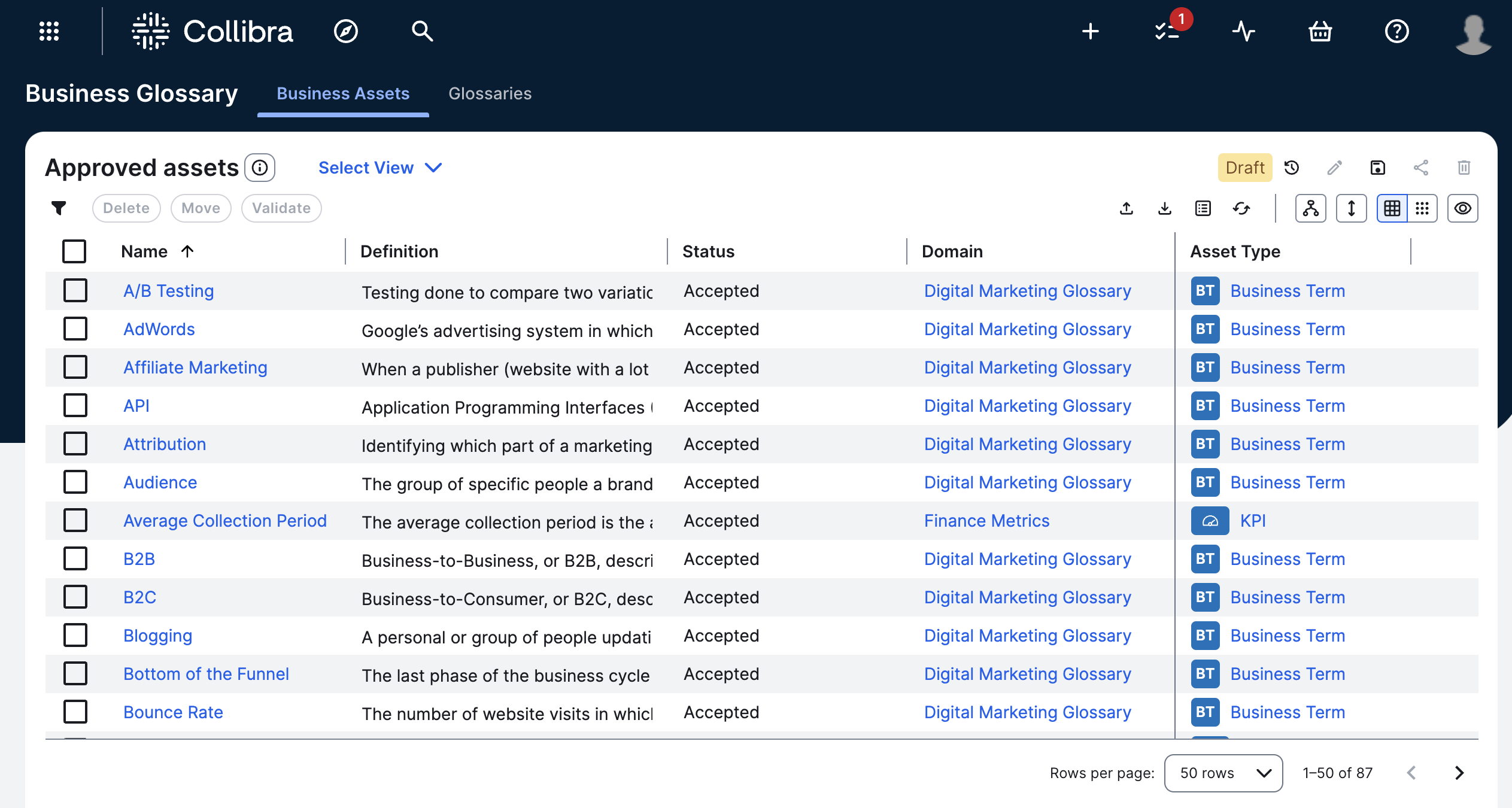 Business Glossary helps decision-makers understand their digital assets from a business perspective. It is a central tool for governing business terms, and it includes a configurable range of asset types, attributes, taxonomy, relations, and adoption statuses. It is also fully integrated with the technological assets and is supported by Collibra's core features, such as reporting, traceability, commenting, and workflows.