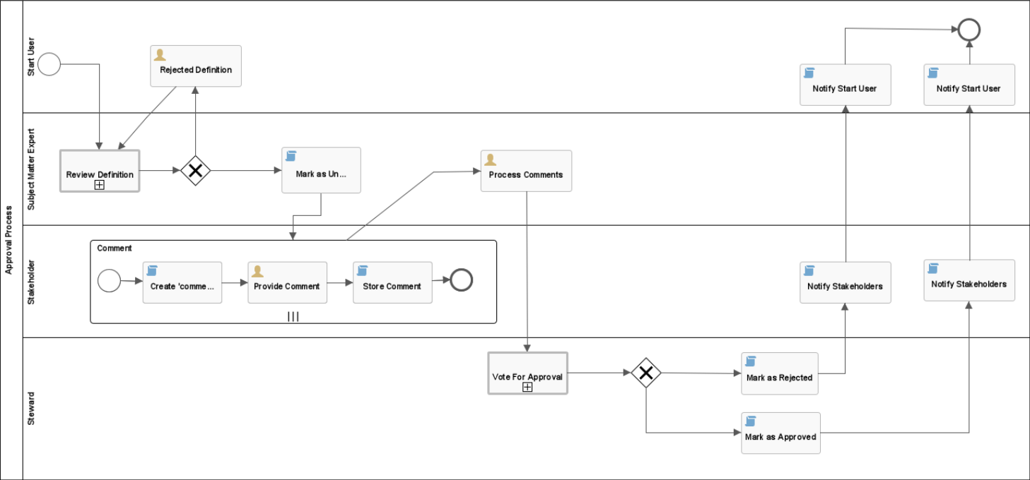 The Approval Process workflow allows you to approve an asset in Collibra. This is a more powerful version of the Simple Approval Process. |