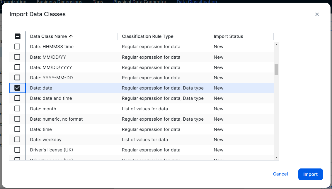 The selected data classes are imported and become available. Any selected, existing data classes are updated with the out-of-the-box classification rules. For more details, go to About out-of-the-box data classes. You can update the imported data class completely based on your needs.