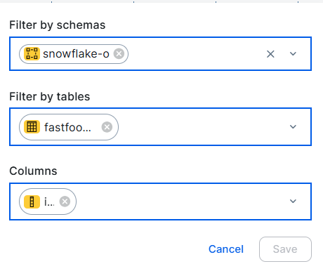 You can limit the available assets by filtering.For Column assets, you can filter based on Schema and Table.