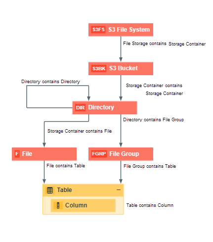 The following image shows the relations between Amazon S3 asset types and the cardinality of the relation types in the asset type assignment.