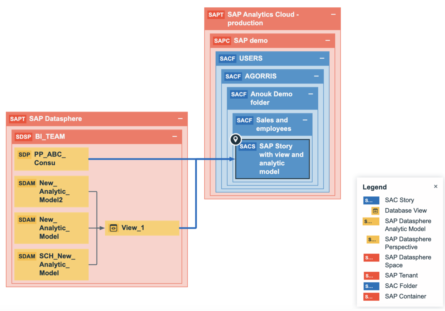 The following image shows the relation between the relevant SAP Datasphere assets and an SAC Story asset. The relation type is Data Asset is source for / source BI Report.