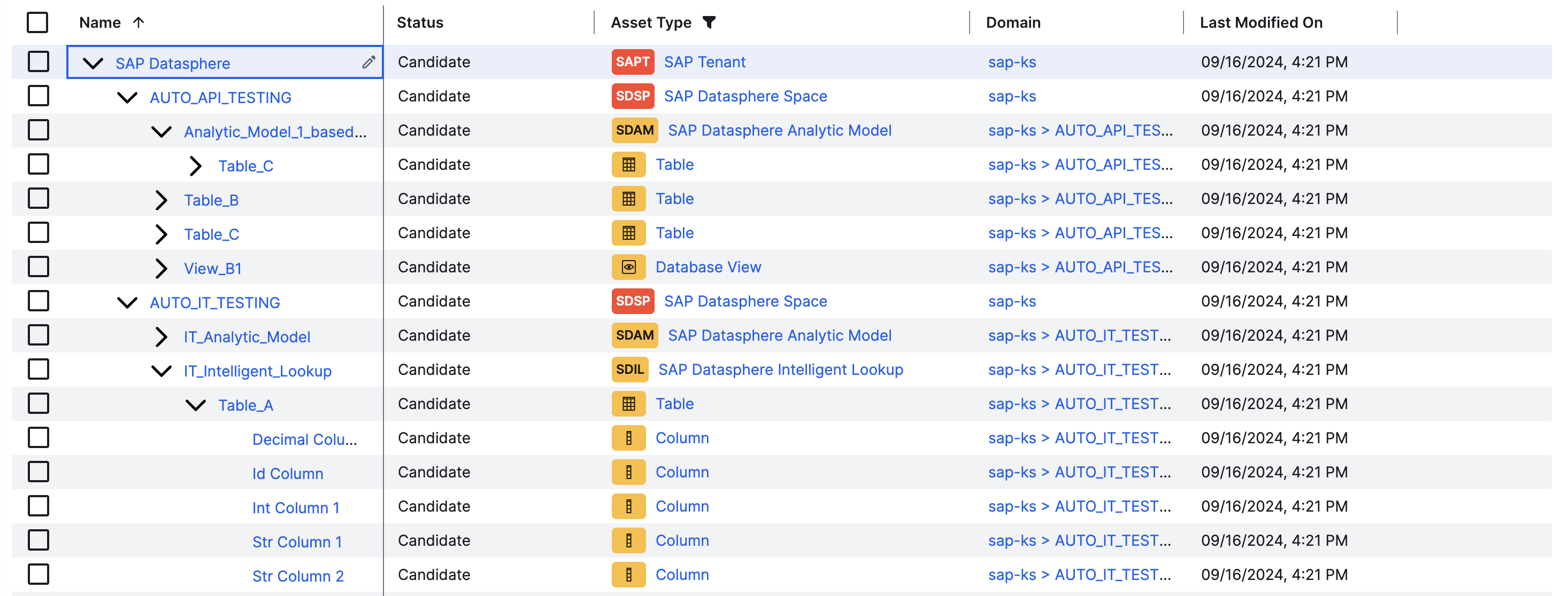 - SAP Datasphere Catalog allows duplicate asset names. For example, you can have two folders with the full name "Workspace A > Folder A". The ingested assets in Collibra will have the same display names, but different full names. The API returns version information to help you differentiate between two such assets.