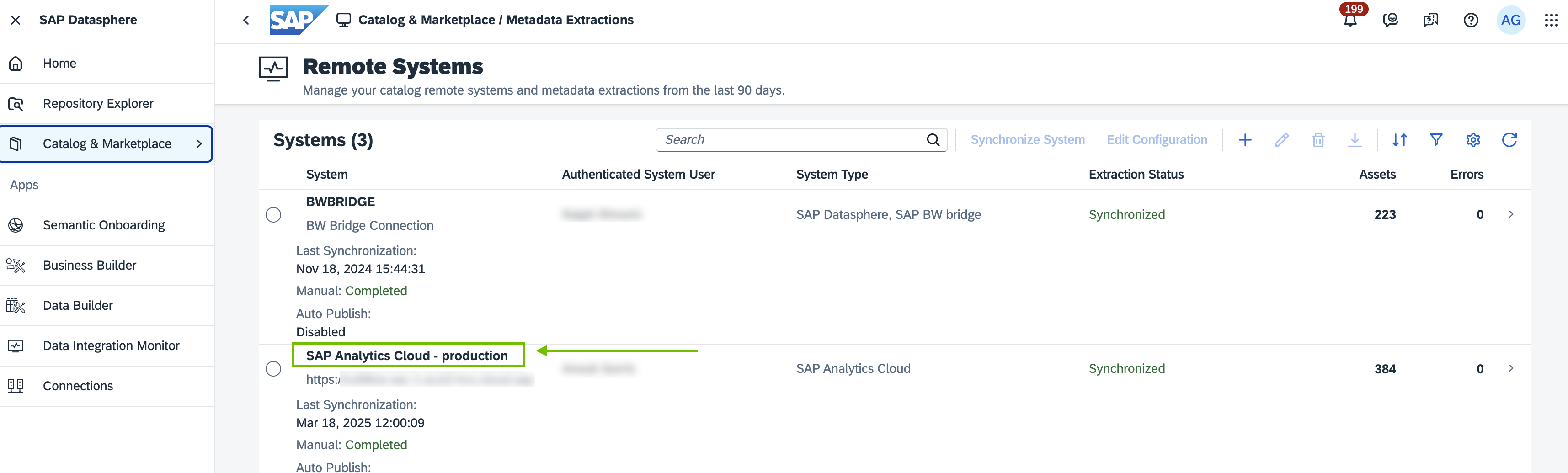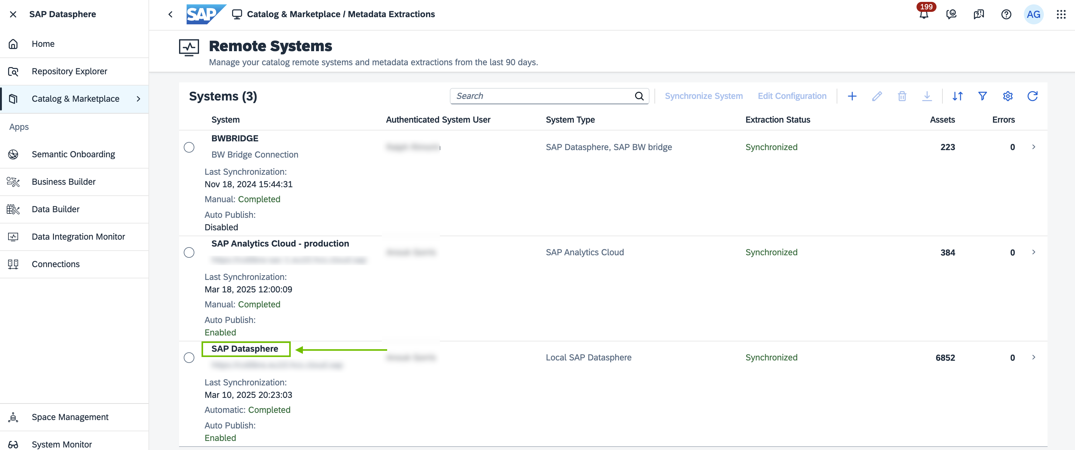How to find the system name in SAPIn SAP, on the SAP Datasphere homepage, click the Catalog & Marketplace tab and then click Metadata Extractions.