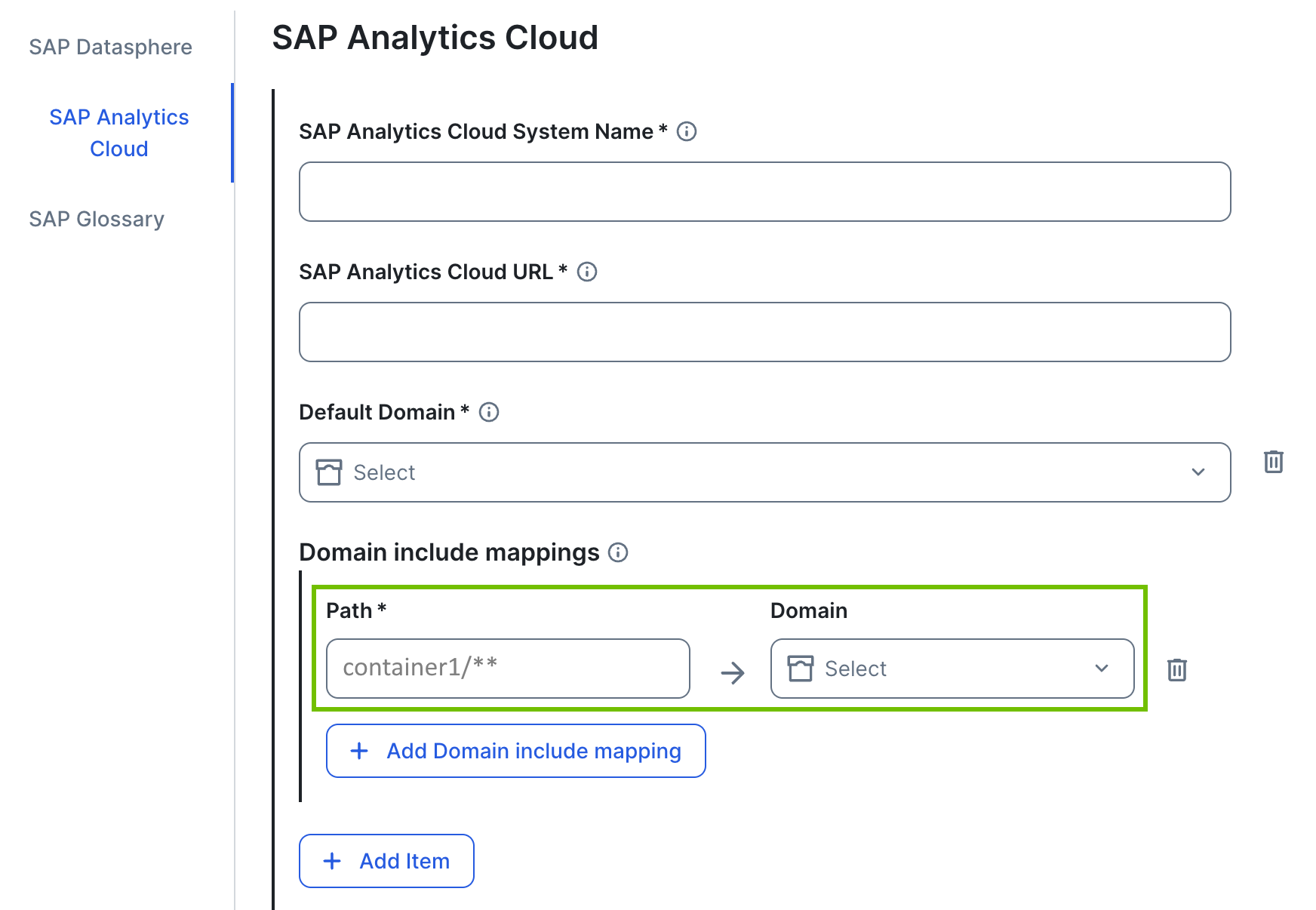 Domain include mappings are essentially filters that allow you to specify the SAP Analytics Cloud containers and folders from which you want to ingest assets. You use the Path field to specify the path to the relevant containers (folders and workspaces), and the Domain dropdown list to select the domain in Collibra in which you want to ingest the assets.