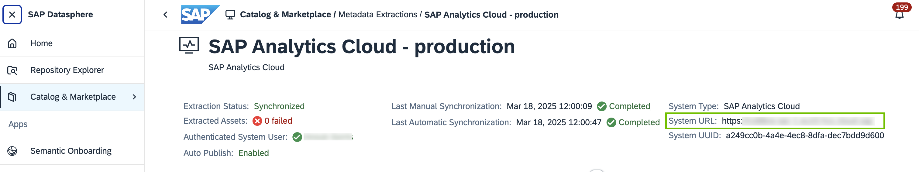 How to find the system URL in SAP- In SAP, on the SAP Datasphere homepage, click the Catalog & Marketplace tab and then click Metadata Extractions.
