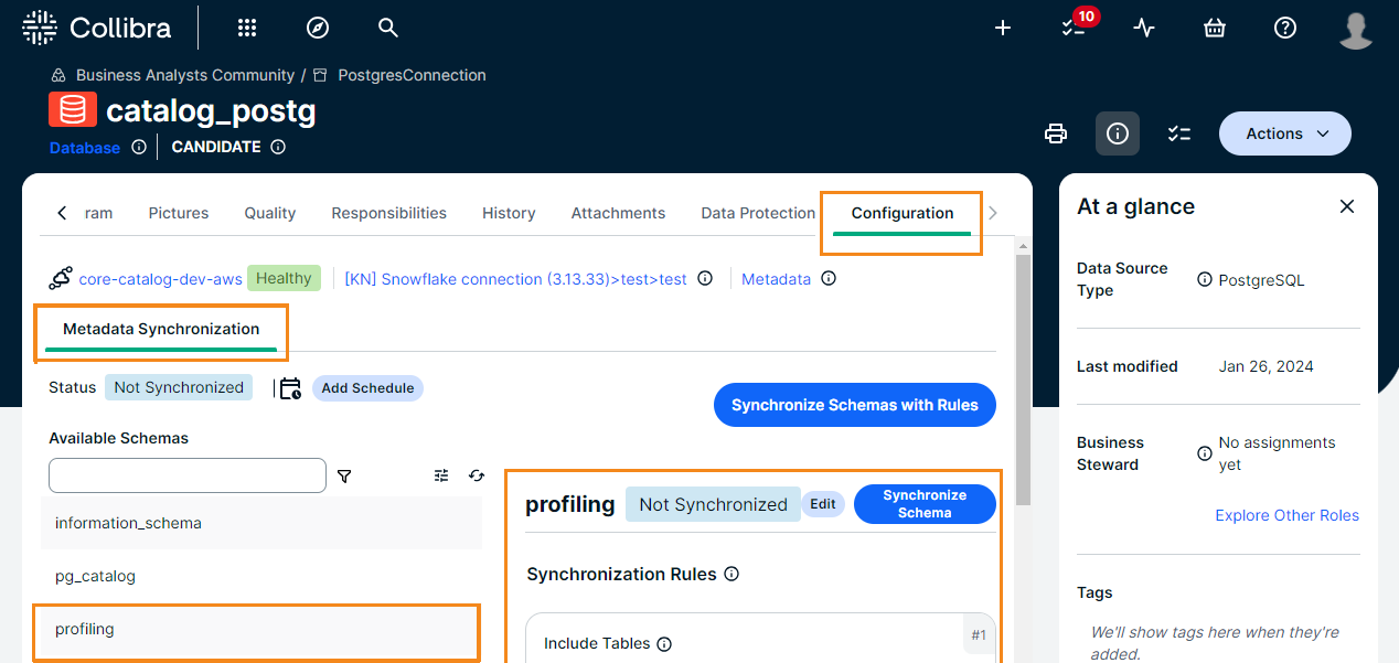 Depending on the migration workflow configuration, a task opens for you to confirm the first synchronization of the migrated schema.- Open the Database asset that was created via Edge and to which you have migrated the schema.