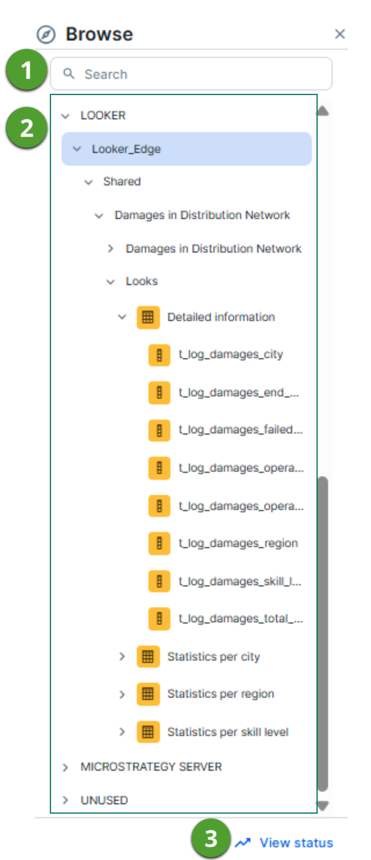 A navigation tree in which you can search for specific data objects and visualize them in your technical lineage. The data objects are grouped by node type and have the following structure: system (if applicable) > database > schema > table > column. Note The list of data objects contains all systems, databases, schemas, tables and columns that were collected from the data sources by Collibra Data Lineage. If available, it also shows the technical lineage of BI sources, for example Power BI and Looker. In that case, the structure follows the existing structure in the BI source metadata. Note The UNUSED branch contains data objects that were detected by Collibra Data Lineage, but are not included in any Technical lineage. Search is not supported in the UNUSED section. If you search for a data object in the UNUSED section, the No object found message is shown. |