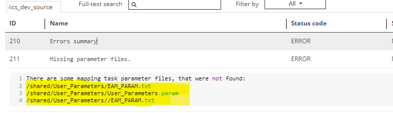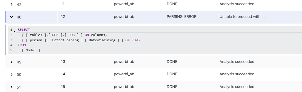 If the analysis results contain errors, the Status code column shows ANALYZE_ERROR and the Name column displays the name of the error. You can find the transformation details by clicking the row.
