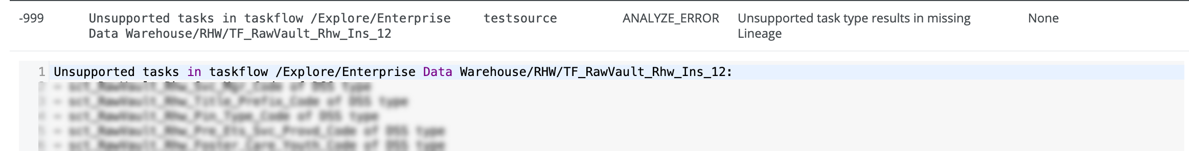 This error occurs when the indicated taskflow contains unsupported tasks. No lineage is created for the supported task types. No action is required.