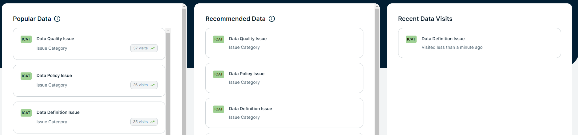 Cards | Cards allow you to navigate quickly to data that might interest you. The available cards depend on whether data discovery is enabled.