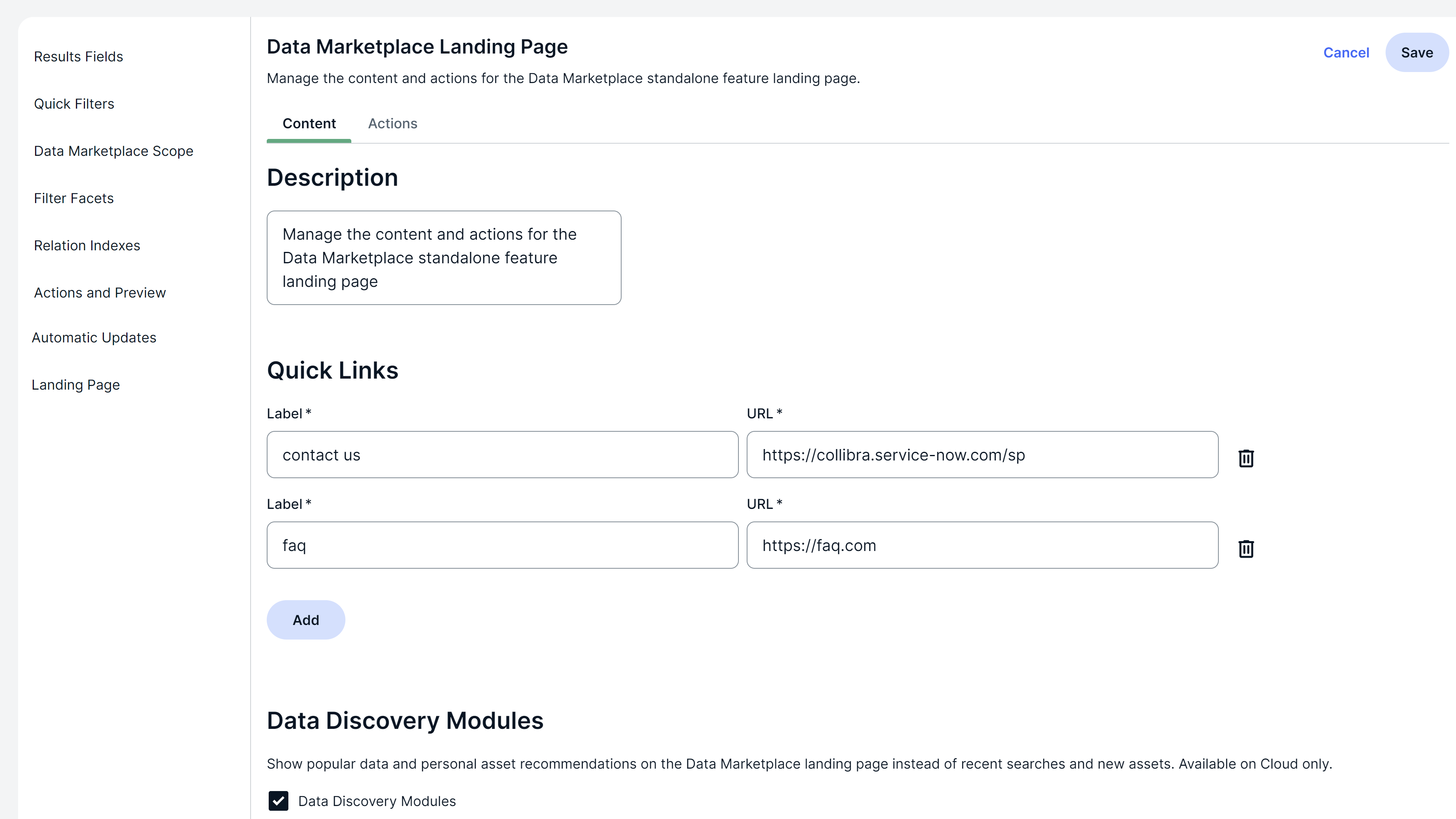 - To show Popular Data, Recent Data Visits, and Recommended Data instead of Recent searches, Recent data visits, and What's New on the landing page, select the Data Discovery Modules checkbox.Note Popular and recommended data becomes available if the Collect Application Usage Data setting in Collibra Console is enabled, which is the default state of the setting. To change this setting, you need to create a support ticket.