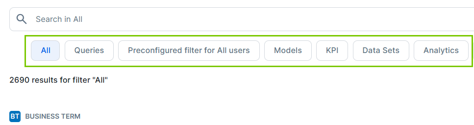 The search results page opens. If the All tab is selected, the page shows all the search results to which you have access within the Data Marketplace scope. - If you want to apply a saved filter, select another tab.Tip