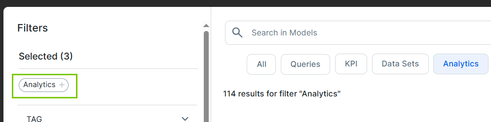 In the Selected area in the Filters pane, an overview of all the filter options that are applied to the search results is shown. This includes the filters applied via a filter tab as well as the filters applied via the Filters pane.