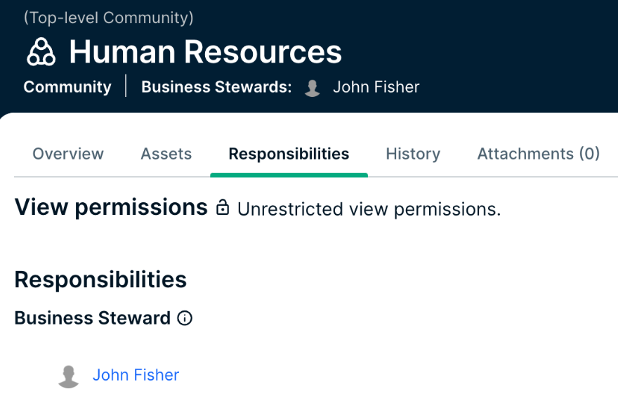 The following image shows the responsibility where the resource role Business Steward has been assigned to user John Fisher for the Human Resources community.