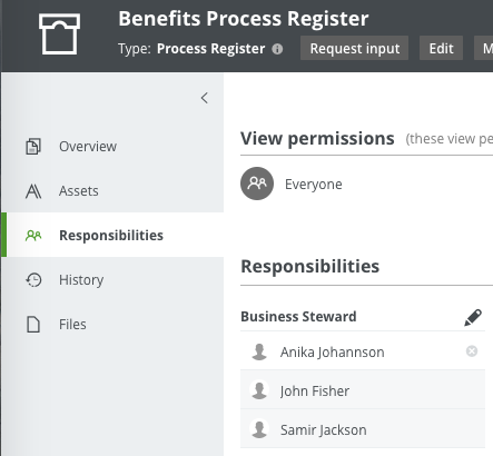 As Anika Johannson is the person most closely tracking the Benefits department's business processes, she has been added as a Business Steward for the Benefits Process Register domain.