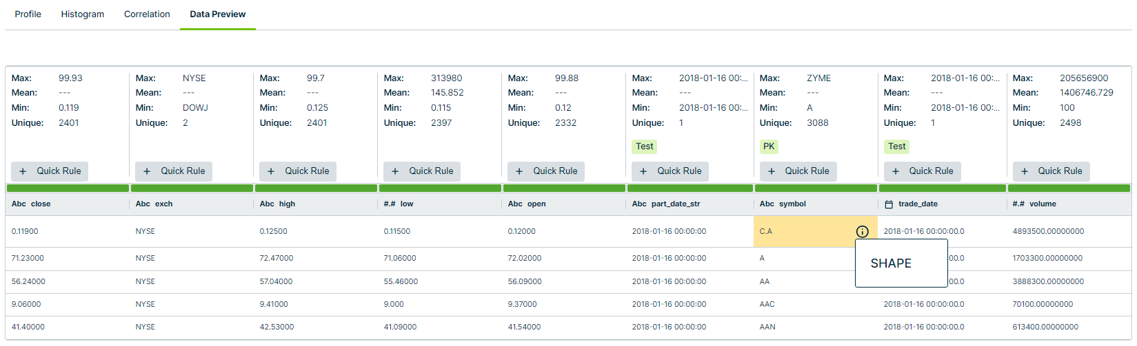 You can also see columns where Collibra DQ discovered specific detections, such as the Shape observation in the "symbol" column in the example above. Additionally, you can click + Quick Rule and select either a Data Type, Data Class, or Template rule from the dropdown menu to automatically apply it to your dataset. You can then find the quick rule on the Dataset Rules page of your dataset.