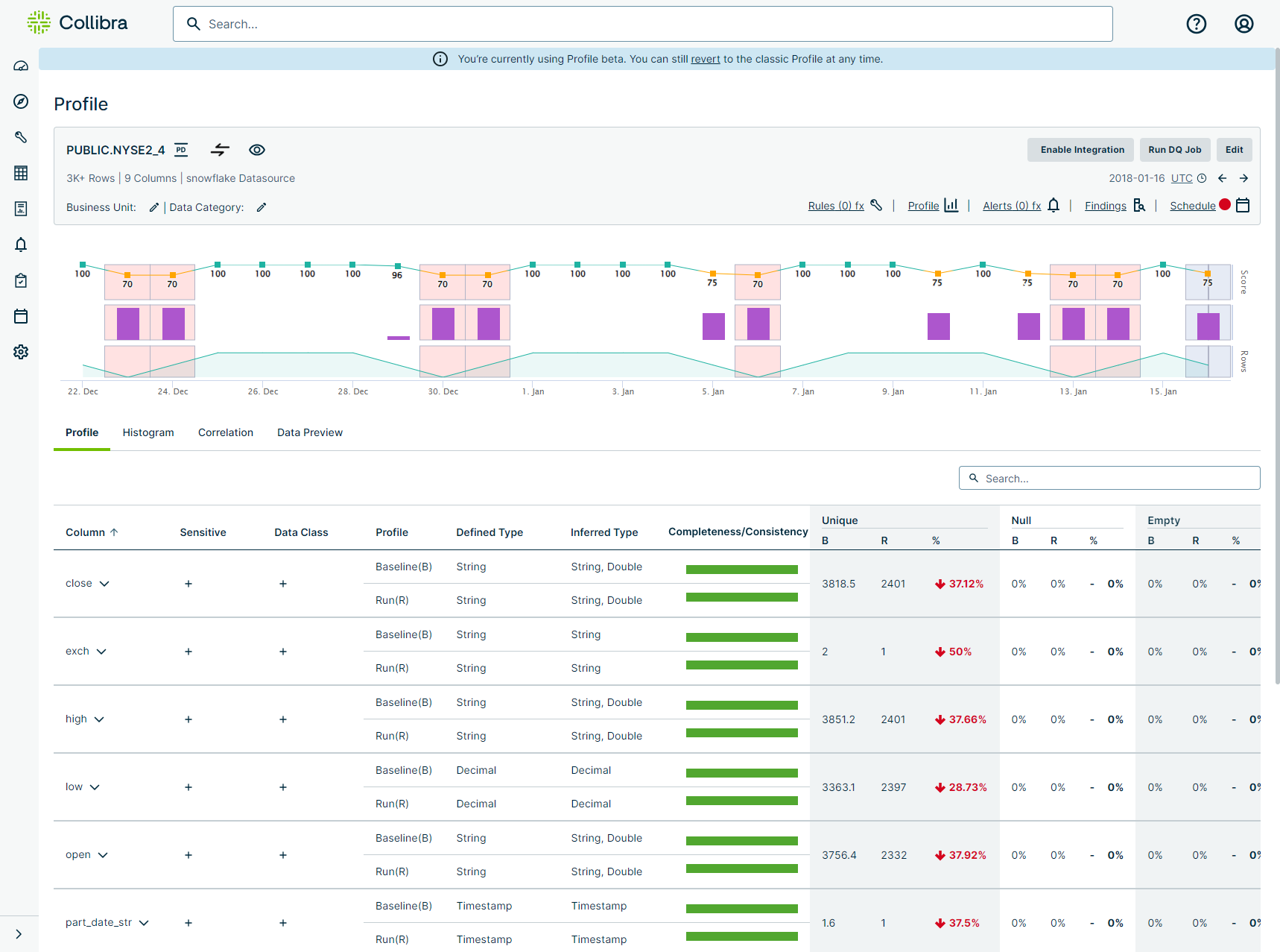 Profile provides a comprehensive analysis of the behavior of your dataset over time. When you run a DQ job, the results of the scan become available for analysis on the Findings and Profile pages. With rich options like the ability to drill down into column-level statistics, create quick rules, and evaluate charts and graphs that show common and emergent trends in your data, you can obtain a granular understanding of the contours of your dataset.