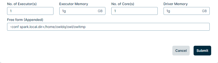 Alternatively, you can add the following to the Free form (Appended) field on the Agent Configuration page to change Spark storage: -conf spark.local.dir=/home/owldq/owl/owltmp