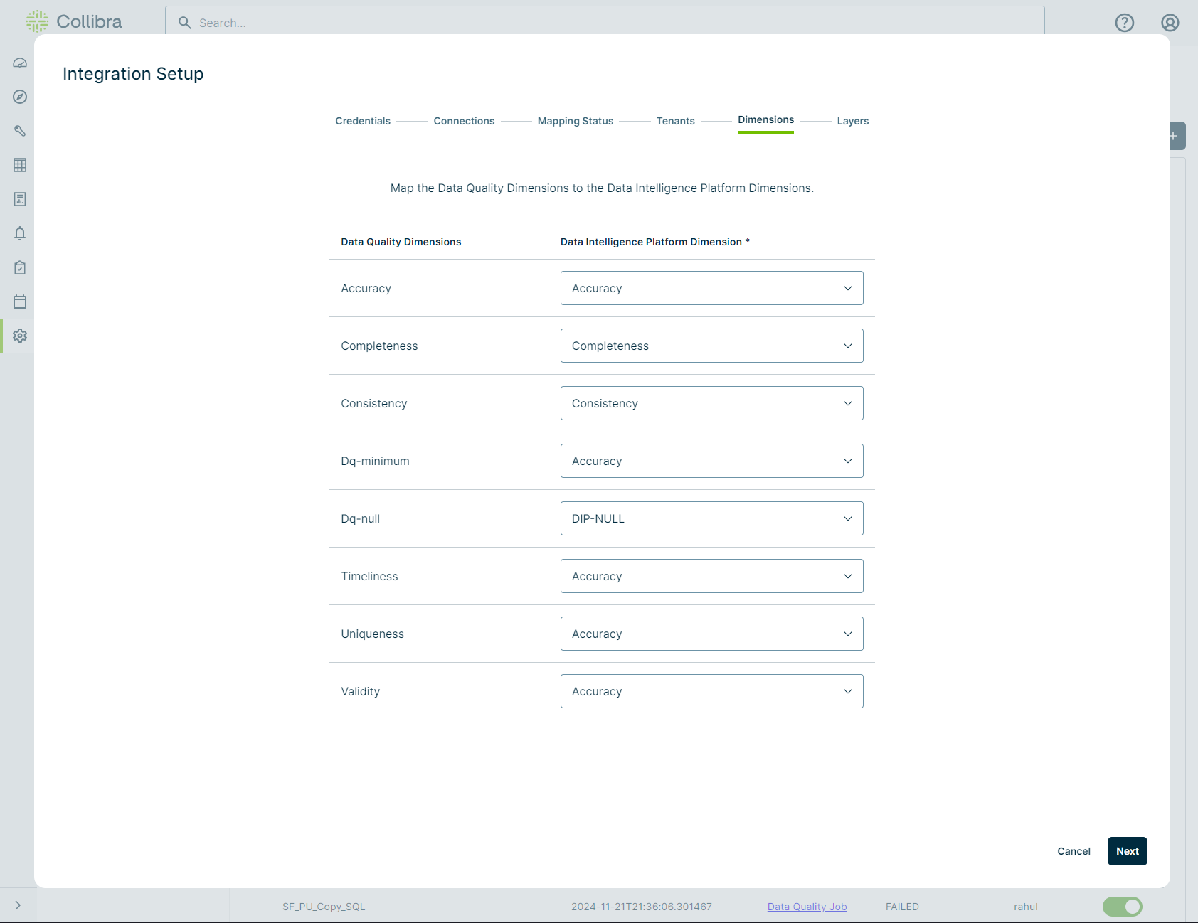 Note All Data Quality Dimensions from your Collibra Platform environment are available to map to Data Quality Dimensions in Collibra DQ, including custom dimensions. However, Data Quality Dimensions from Collibra DQ are not customizable at this time.