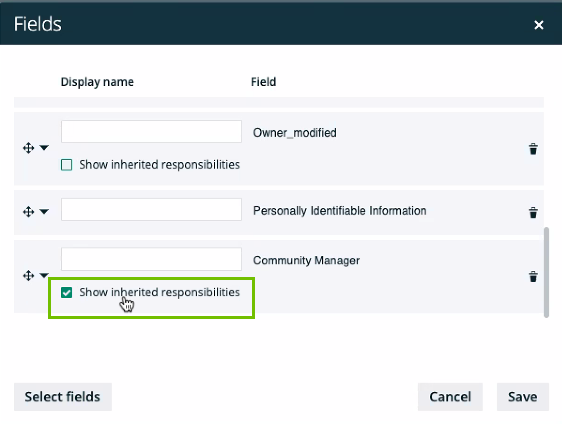 - The “Show inherited responsibilities” checkbox is now available in the views on Catalog index pages, such as "Reports" and "Data Sources". For detailed information and the required setup, go to Show responsibilities in an asset table. (ticket #124292, 124682) (idea #DGCPLAT-I-1435)