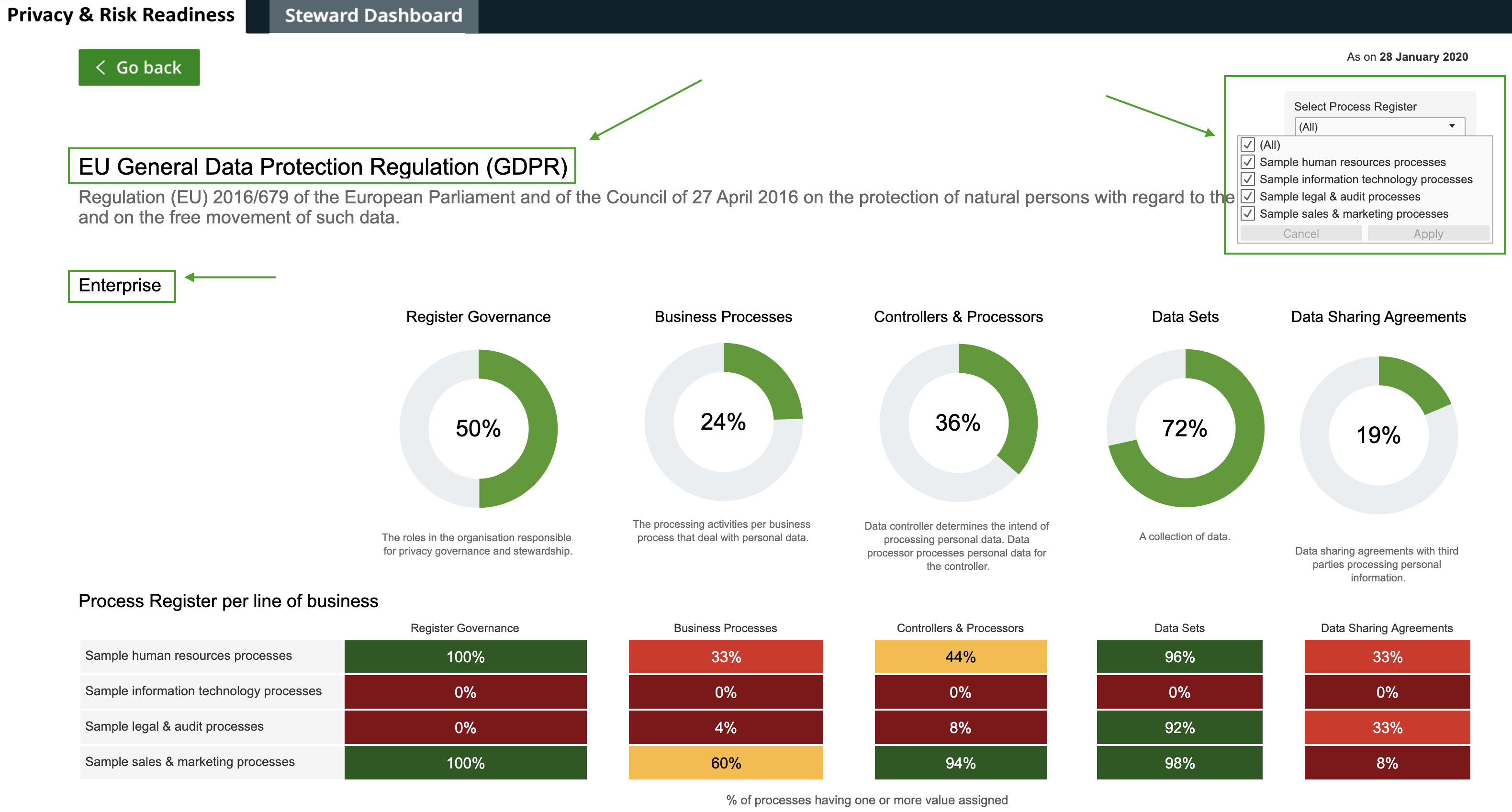 Drilling down further, you can monitor the process registers of specific lines of business, including the business processes, data sets, and third-parties related to a specific process register.