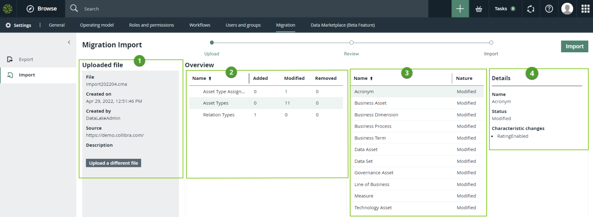 Using the Migration feature, you can import an archive file containing model objects of a Collibra Platform environment.